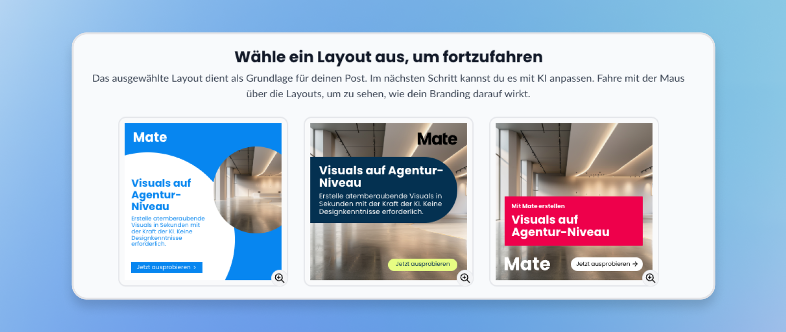 Klicke auf das Layout, das dir am besten gefällt. Das wird jetzt deine Basis für weitere Iterationen. Falls dir keins der Layouts gefällt, kannst du einfach im Chat schreiben: "Zeig mir weitere Varianten" – und Mate generiert neue Vorschläge. Du kannst auch spezifischer werden und nach Layouts mit mehr Farbe, minimalistischeren Designs oder anderen Formaten fragen.